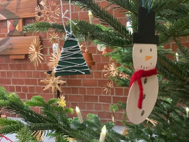 Dieses Jahr gab es eine echte Neuerung im Hustadtzentrum: der Tannenbaum hatte neuen, von den Kindern selbst gebastelten Schmuck. Und er war so groß, dass er nur knapp in den Raum passt.