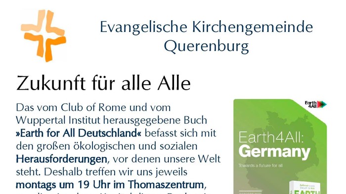 Das vom Club of Rome und vom Wuppertal Institut herausgegebene Buch »Earth for All Deutschland« befasst sich mit den großen ökologischen und sozialen Herausforderungen, vor denen unsere Welt steht. Deshalb treffen wir uns jeweils montags um 19 Uhr im Thomaszentrum, um die einzelnen Kapitel dieses Buches im Detail zu diskutieren. Auf persönliche Fragen werden gemeinsame Antworten gesucht und auch oft gefunden.